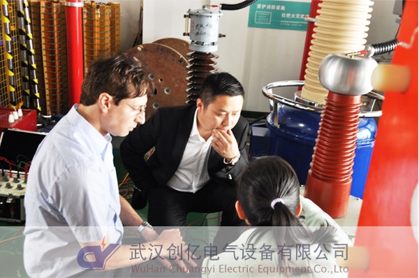 他們此行主要目的是考察串聯諧振和變壓器類系列產品,針對Lalit告知其被試品是發電機,需要對其做局放耐壓試驗。要滿足發電機單相對地時做耐壓試驗,又滿足三相一起做耐壓試驗。通過與客戶進行詳細深入的技術溝通后,最終給客戶選定1200kVA/60kV工頻串聯諧振試驗系統。Lalit也非常贊許!隨后他還詳細看了超低頻、回路、互感器等設備,并一一為其做了演示試驗。在考察的過程當中他們都聽得特別認真仔細,還生怕漏掉了哪個環節,時不時拿出相機來拍照,做錄。