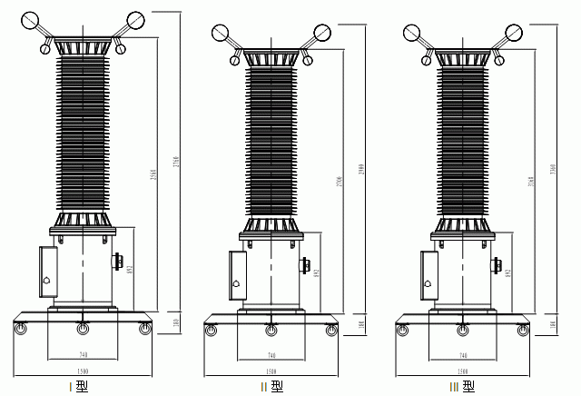 | 說明 | 1. 準確度為0.05級的變比實際誤差可以滿足0.02級要求; 2. 可以根據用戶的實際需求,在合理范圍內增加相應變比; 3. 臥式運輸支架和四輪底座為可選配置 (表中的尺寸均不帶底座及均壓環) 。 | ||||||||
