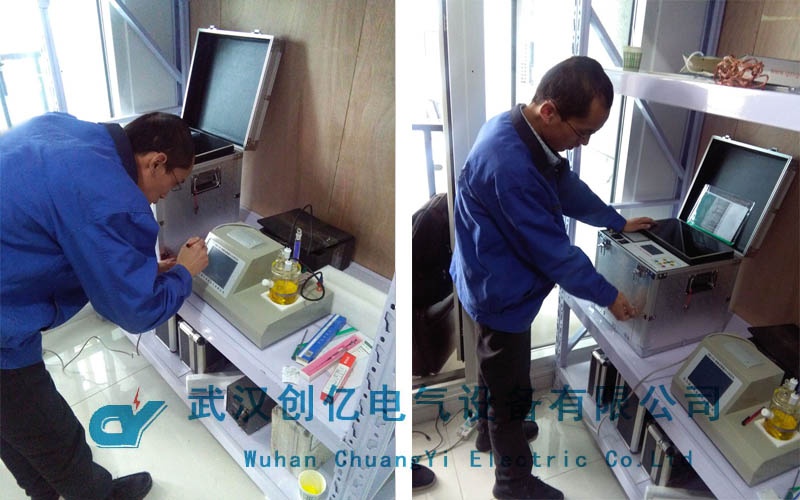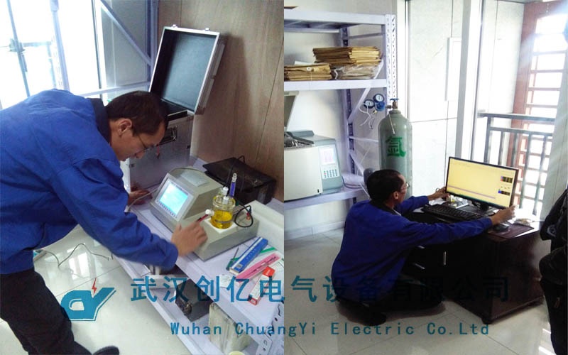 本次調試主要是以客戶的變壓器油作為被試品,首先是對CYOT-80按照國際模式進行實驗。試驗過程中詳細講解了操作注意事項。在CYW-106的試驗過程中,首先要對電解池及電極部分組裝,然后用50ul注射器慢慢注入純水直到電解池油深褐色變為淺黃。然后是電解液達到平衡點,再用1000ul注射器注入1ml的變壓器油樣后開始測定。該操作過程需要耐心和仔細,因此在試驗過程中,技術人員詳細操作,并指導客戶進行試驗。