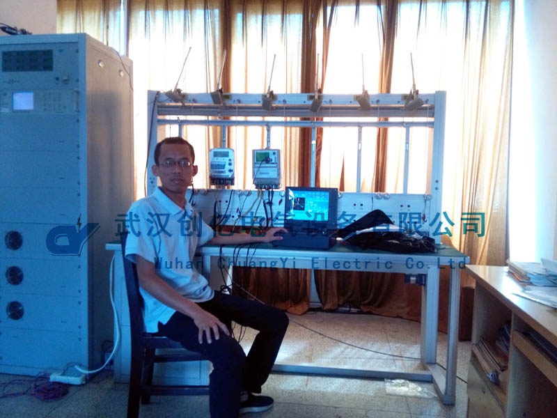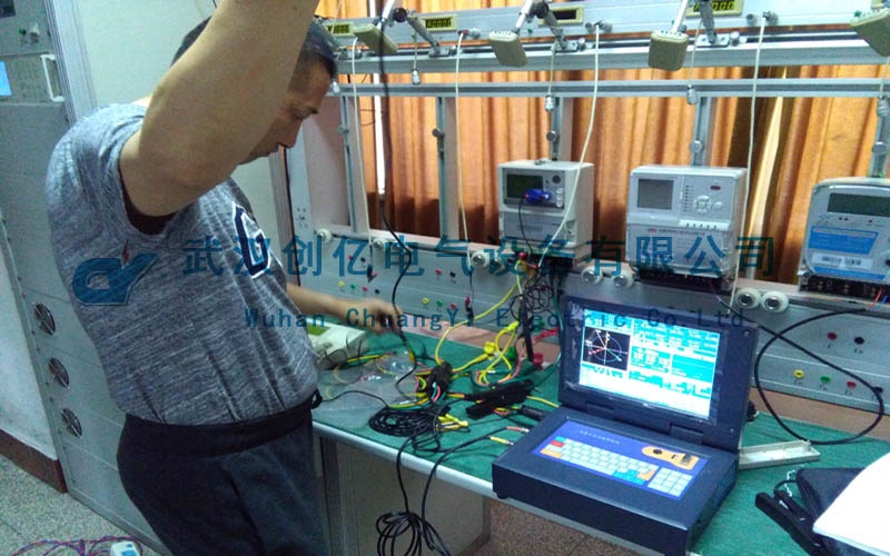 現場采用客戶的三相三線電能表為被試品向客戶進行操作演示,并培訓客戶使用我們的產品。我司技術人員先和電站人員前往實驗室進行試驗。首先使用電能表校驗臺模擬電能表的負荷,指導客戶動手操作,將CYYM-3B的電壓電流線接到三相三線的電能表上。然后進行模擬實驗。