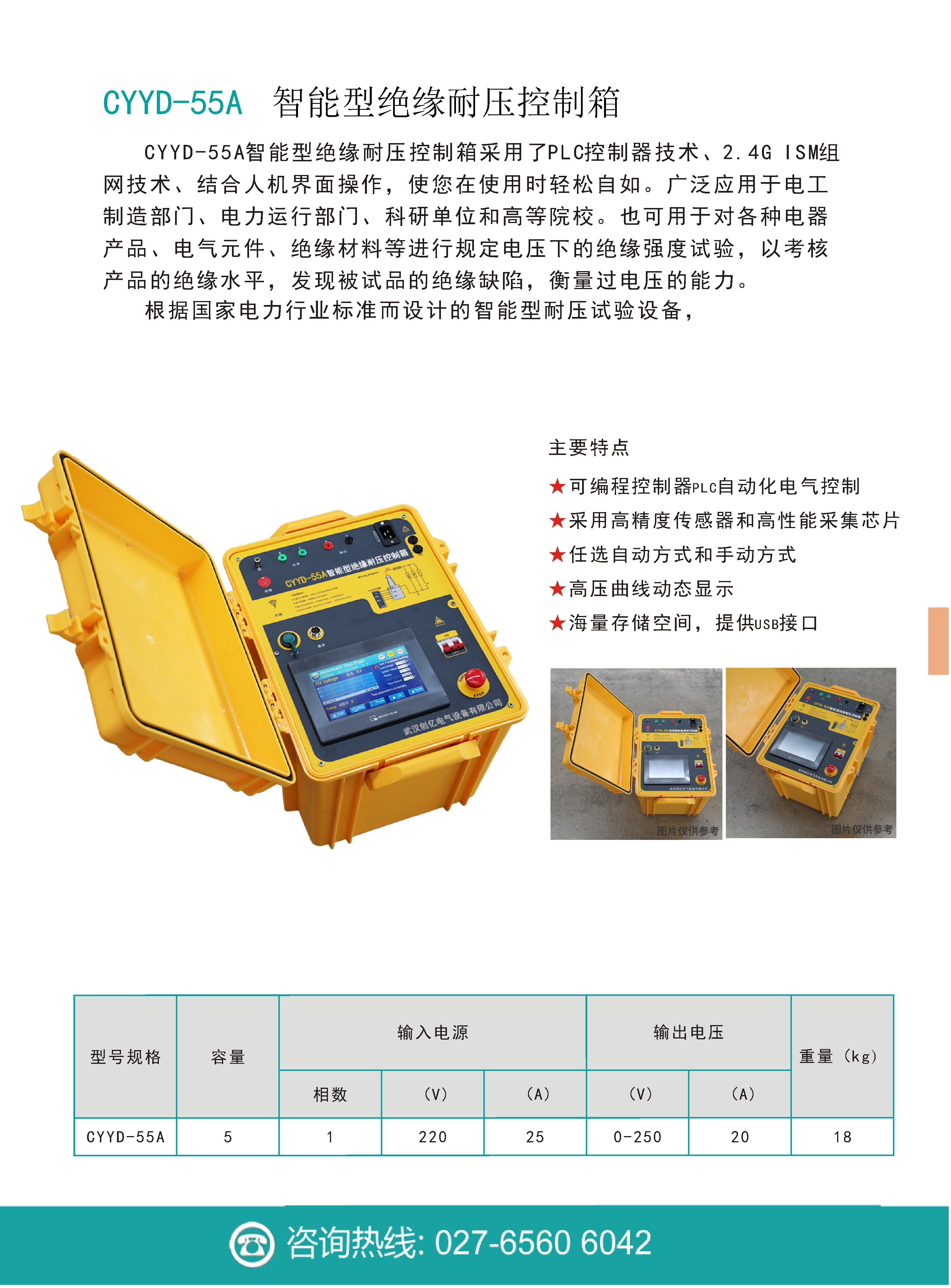 CYYD-55A智能型絕緣耐壓控制箱是根據國家電力行業標準而設計的、性能先進的智能型耐壓試驗設備,本設備采用了PLC控制器技術、2.4G ISM組網技術、結合優良的人機界面操作,使您在使用時輕松自如、得心應手。可用于對各種電器產品、電氣元件、絕緣材料等進行規定電壓下的絕緣強度試驗,以考核產品的絕緣水平,發現被試品的絕緣缺陷,衡量過電壓的能力。廣泛應用于電工制造部門、電力運行部門、科研單位和高等院校。