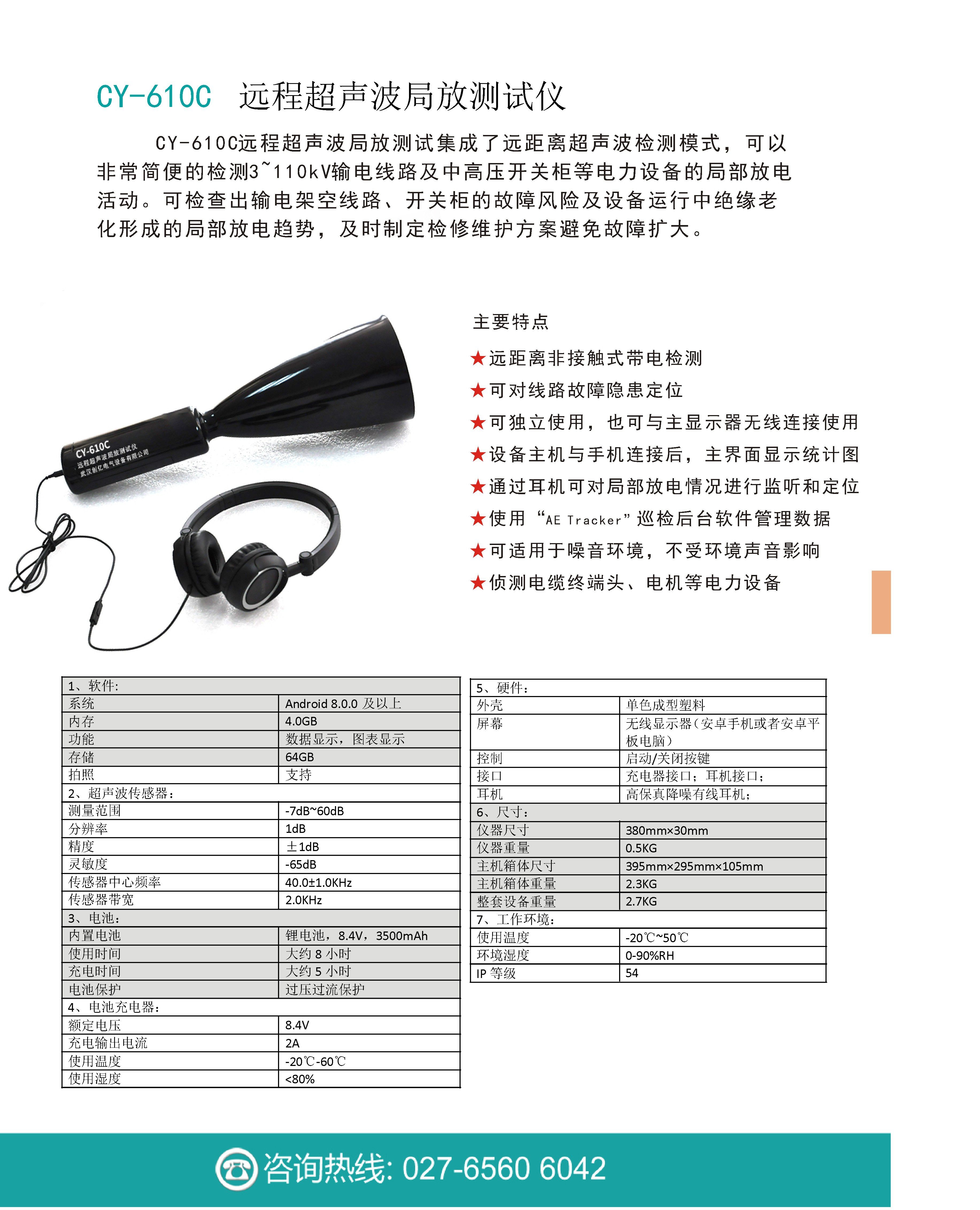 診斷和檢測局部放電是一種非常有效的中壓和高壓配電網絡狀態監測技術,可以涵蓋開關、電纜、架空線、變壓器、GIS。局放是中壓和高壓設備和電纜絕緣故障的常見原因之一。局部放電檢測可以檢出有害的缺陷,從而幫助確認未來的潛在的故障。在長期運行中,高壓開關柜受電、熱、化學及異常狀況影響形成絕緣劣化,易導致電氣絕緣強度降低甚至發生絕緣事故,造成非常大的經濟損失和供電損失。實踐表明:局部放電是導致運行設備絕緣劣化,發生絕緣故障的最主要原因。CY-610C遠程超聲波局放測試儀采用超聲頻譜探測頭(傳感器)采集超聲波信號通過分析信號音來診斷配電線路事故隱患的帶電檢測診斷裝置。此裝置在帶電的情況下判斷有故障隱患的線路位置和故障類型,在采集超聲波異常信號后,傳輸到主機,轉換為可聽聲音信號及波形,最后通過分析軟件準確的診斷出事故隱患類型及不良等級,可以幫助巡檢人員準確發現線路故障隱患預防大事故的發生,避免了不必要的停電,縮小了停電范圍,提高了巡檢人員的工作效率和電力線路的健康指數。我公司目前已經在全國范圍內多個省市進行了使用,效果良好。