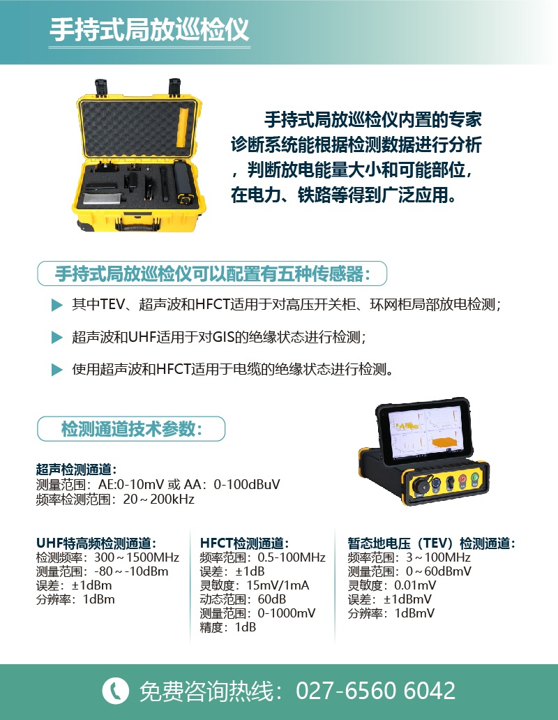CYPD-414H手持式局放巡檢儀配置有五種傳感器,其中TEV、超聲波和HFCT適用于對高壓開關柜、環網柜局部放電檢測;超聲波和UHF適用于對GIS的絕緣狀態進行檢測;使用超聲波和HFCT適用于電纜的絕緣狀態進行檢測。內置的專家診斷系統能根據檢測數據進行分析,判斷放電能量大小和可能部位,在電力、鐵路等得到廣泛應用。